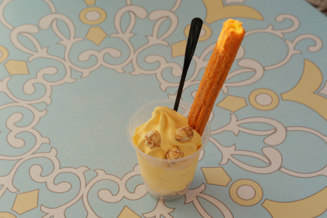 ほどよい甘さのパンプキンソフトクリームの下には、キャラメルポップコーンがぎっしり。パンプキンチュロスも加わり、おいしさ三重奏!遊び疲れて休憩したいときに、おすすめの一品です。