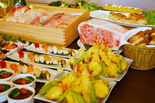 多彩な料理を堪能できるディナービュッフェでは、海の幸、山の幸ともに味わい尽くせます。