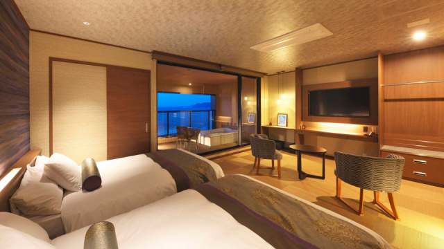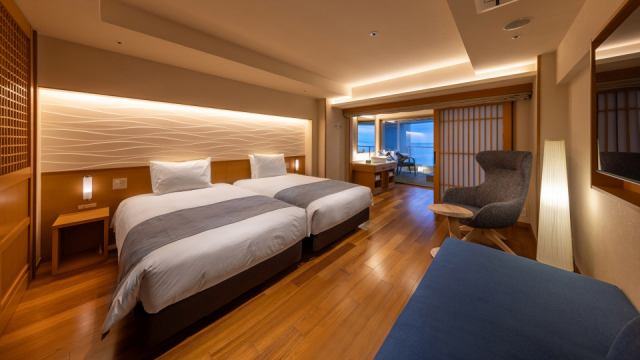 露天風呂付客室が新設されたほか、くつろぎの和洋室や個室の食事処、貸切露天風呂やオーシャンスパもリニューアルし、優雅な時を過ごすことができます。
