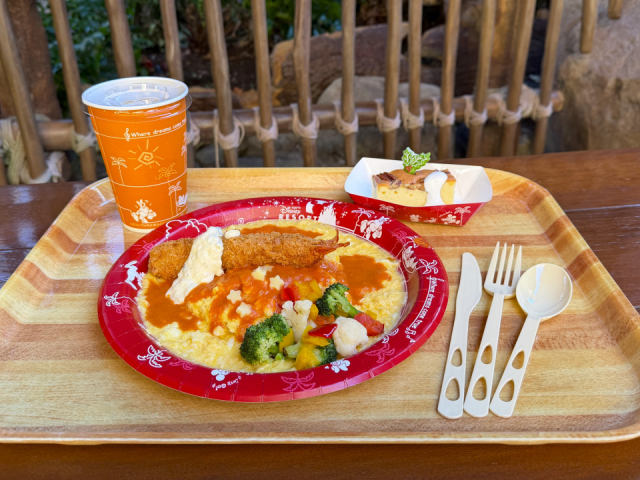 東京ディズニーランド「グランマ・サラのキッチン」では、大きなエビフライと色とりどりの野菜が添えられた、エビトマトクリームソースのオムライスが登場!スペシャルセットには、ピーカンナッツのケーキとドリンクも付いています。