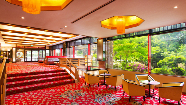 鶴仙渓を望むロビーからは、開放的な美しい景色を眺めることができます。絶景立ち湯露天や檜や岩造りの貸切風呂(有料)も人気の理由。