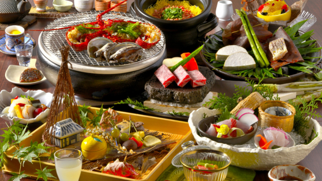 総料理長が自ら目利きして仕入れる伊豆近海の魚介や朝採れ野菜を使い、美しく盛り付けられた会席料理が評判。ゆっくりと名湯に浸かり、心に残る美食に舌鼓を打ちましょう。