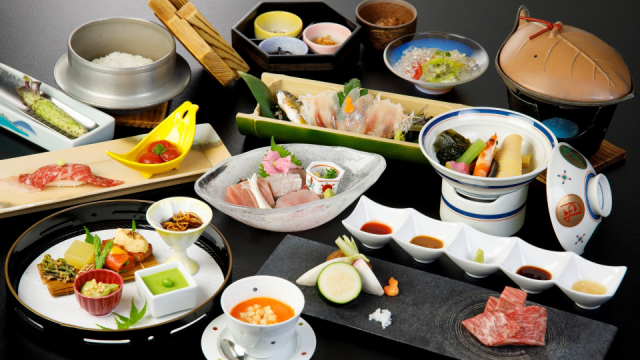 夕食は「食べる伊豆」をテーマにした会席料理を満喫しましょう。朝獲れ鮎の姿造り、ブランド牛「静岡 和牛頂上」の炙り鮨がこの宿の名物です。