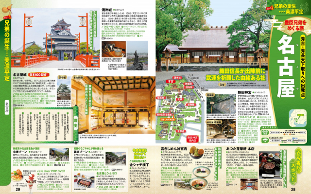 秀長・秀吉兄弟のストーリーを6つのパートに分けてご紹介。ゆかりの地(名古屋、岐阜、長浜、姫路、大和郡山、大阪、京都など)を、まっぷるならではの詳細なガイドでご案内します。