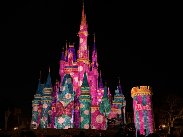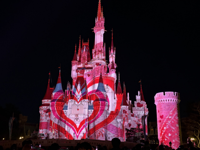 音楽をバックに、シンデレラ城にリボンやハートのプロジェクションマッピングが映し出され、ポップで幻想的な世界が広がります。