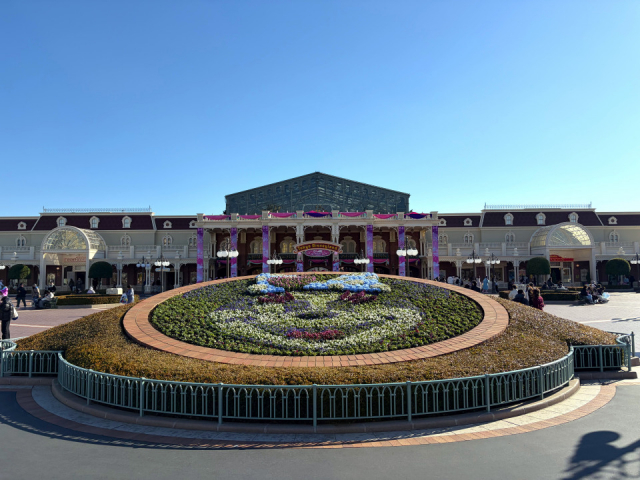 エントランス前の花壇ではミニーがにっこりごあいさつ