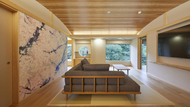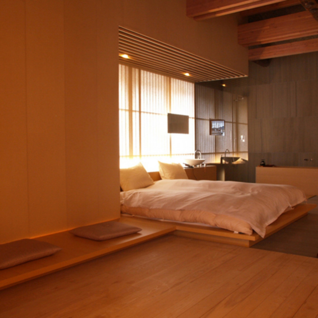 「旅館 藤屋」は、竹や和紙、ステンドグラスを取り入れたモダンなたたずまいが印象的な宿。宿の改修を手がけたのは隈研吾氏。感性が光る建築美は必見です。