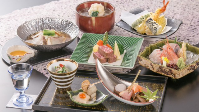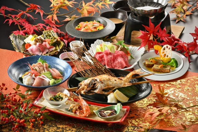 福井の旬の食材を使った料理を用意。春から秋までは若狭牛や地魚などのビュッフェを、冬には冬の味覚「越前がに」の会席料理を提供してくれます。