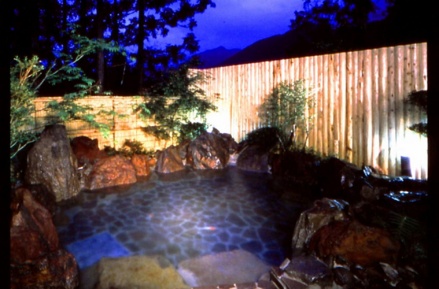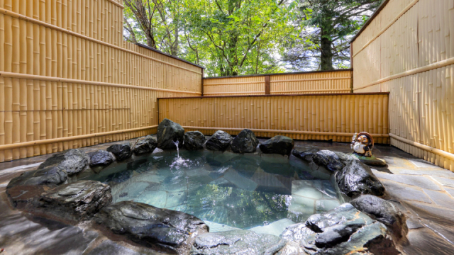 露天風呂は打たせ湯付きの岩風呂と水中光が輝く洋風の2種類を楽しめます。宿1棟貸しが人気大人数や1人1部屋利用など使い方自由です。