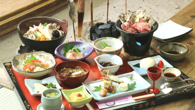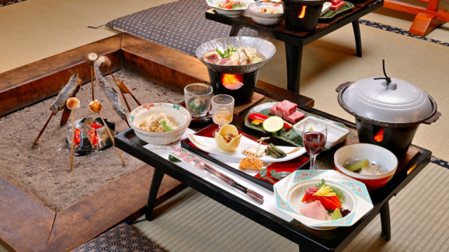 露天風呂では湯に浸かりながら森林浴気分を味わえたり、囲炉裏を囲んで鹿や岩魚、山菜などを炭火で炙る「平家鷹狩料理」も自慢です。