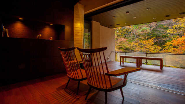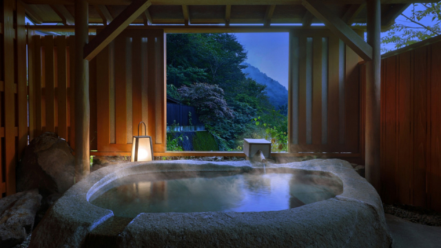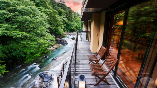 「四万温泉 豊島屋」は、江戸時代から続く老舗。3つの源泉を有し、四万温泉では唯一、全館源泉100%となっています。6つの客室に専用露天風呂があり、うち5つは四万川を望めるのが魅力です。