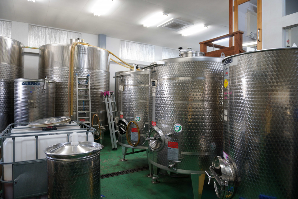 「木の樽ではなくステンレス製のタンクで熟成し、乳酸発酵をさせないことで、甲州ぶどうの香りを最大限に引き出しています」とは、ワイン醸造責任者のエイミー・シンガーさん。事前予約すれば、ワイナリーの工場見学も可能です。