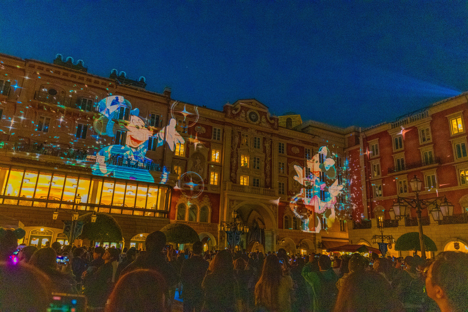 メディテレーニアンハーバー一帯の明かりが消えると、25周年のテーマソング「Come Join the Jubilee」が流れ、東京ディズニーシー・ホテルミラコスタの壁面に鮮やかな映像が投影されます。