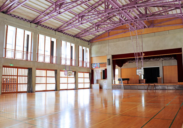 ちょうなん西小の体育館は、天井が高く、壁は大きい格子窓。光がたくさん入る明るい空間です。