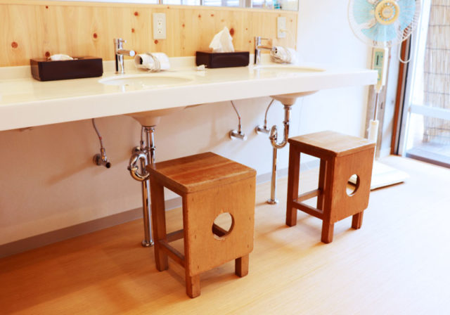 そして、学校の教室を丸ごと改装したお風呂場も気になる所。お風呂場のドアを開けると、なんとそこにはヒノキが香る浴槽が!