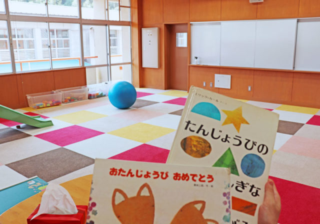 こどもに優しいふかふかのフロアシート。遊具や絵本も充実しています。