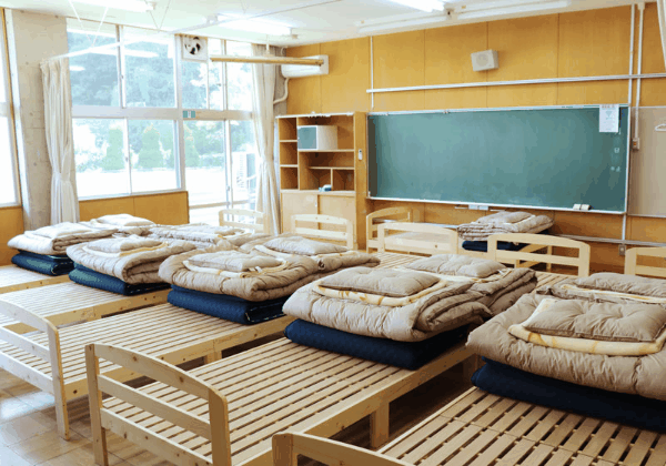 広~い教室内に並ぶ布団。