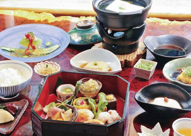- 豆腐懐石松葉=4104円/松籟=4968円/松風=6264円(昼)・6804円(夜)/松籟鍋(夜のみ)=8100円/松寿(夜のみ)=10800円/