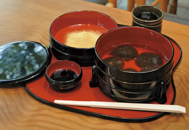 その店奥には、「茶房 玄以庵」があります。生菓子をお抹茶とともに楽しめるいわゆる和カフェです。店のイチオシメニューは注文を受けてから練り上げるわらび餅。上質の秋取りわらび粉を100%使用した品です。塗の器に入ったわらび餅は、まず何もつけずにわらび餅本来の味を。次に黒蜜を付けたり、きな粉を付けたり、両方を付けたりといろいろアレンジして味わってください。
