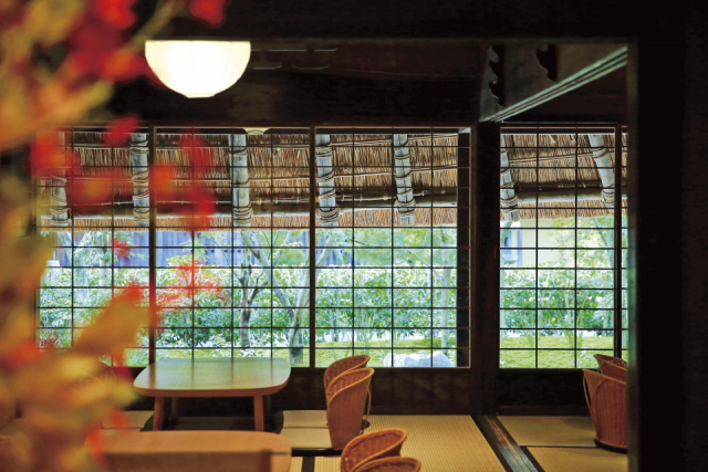 白いのれんをくぐると、茅葺屋根の建物にまたまたのれん。そこには「エスプレッソと」と記されたのれんがかかっており、ここがカフェであることが分かります。この建物は、築210年の京都府指定有形文化財の歴史ある「旧小林家住宅」を改装したものです。それぞれの席から庭園を眺めることができます。