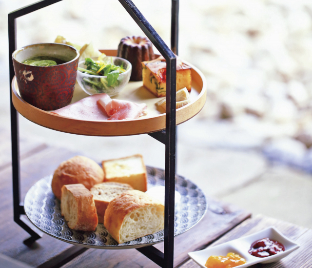 こちらで、ぜひ味わいたいスペシャルメニューはブランティーセット。下段にはお隣の「パンと」で焼き上げたパン、上段には生ハムやチーズ、サラダ、ケークサレ、フルーツサンドが盛られています。もちろん、抹茶のティラミスやカヌレなどのスイーツも!