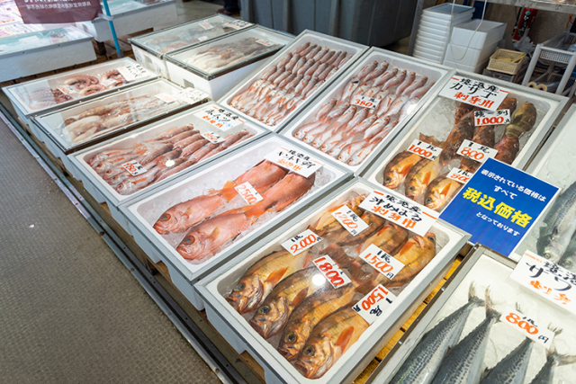境港鮮魚仲買組合の仲買人が直営する海産物店なので鮮度バツグンの魚がずらり!館内に並ぶ色とりどりの鮮魚は、冷蔵宅配便で送ってもらうこともできますよ。