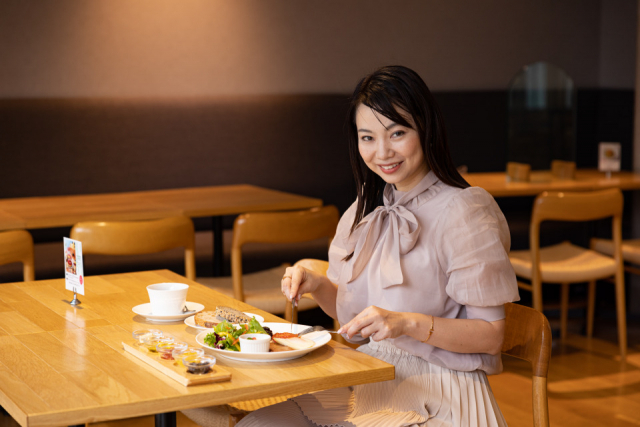 今回、柴本さんが選んだ「アンデルセンモーニングプレート」は、ソーセージや目玉焼き、サラダやヨーグルトのほか、色々な種類のパンがお好きなだけ楽しめるブレッドバーとドリンク(ホットコーヒーに限りお替り自由)がセットになったもの。ブレッドバーには、パンを楽しむさまざまなジャムやオリーブオイルも充実。北欧の名作家具がさりげなくレイアウトされた空間で、心地よい朝の時間を味わってくださいね。