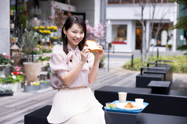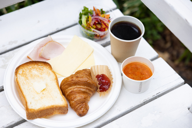 また、1階のサンドイッチスタンドでは毎日味わえる6種類の朝食がスタンバイ。「たっぷりモーニング」は、イギリスパン1枚+選べるパン1種類、選べるサイドメニュー4品、ドリンクが付いた、その名の通りボリュームたっぷりな朝食です。焼きたてのイギリスパンはパンの厚さ(4~6枚切り)もオーダーでき、トーストすることでカリッと香ばしいクラスト(焼き皮)が際立ちます。木々に囲まれた屋外のヒュッゲパークで味わうのもおすすめです。