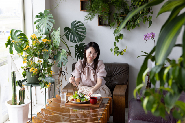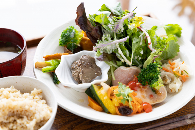 こちらでいただけるのは、広島近郊で採れた有機野菜を主役にした料理。「四季の農園御膳」は、旬野菜のおばんざい5種類、日替わりのメイン料理、有機サラダ、味噌汁、玄米ご飯が付いた看板メニューです。オーナーの楠木さんの「野菜を通じてワクワクしてほしい」という思いを体現したもので、ゴボウをスパイスで炊いたり、カラフルな野菜を添えたり、自由な発想と遊び心にあふれた料理にファンも多いです。