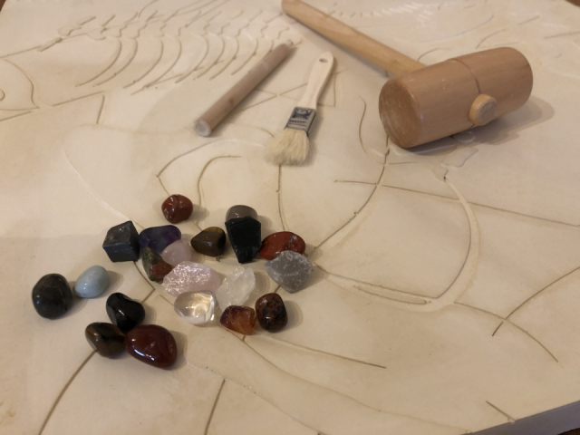 ハンマーとノミを使い、石膏プレートに埋められた本物の鉱石を発掘するワークショップです。