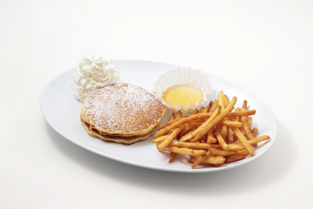 子どもが大好きなパンケーキのプレートセットです!メープルホイップパンケーキ、フレンチフライにドリンクが付いた特別セット。子どもが笑顔になること間違いなし!