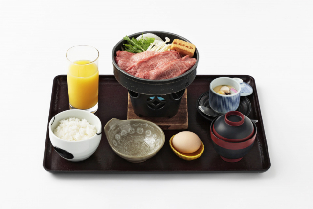 松阪牛のすき鍋にご飯、みそ汁、茶碗蒸し、ワンドリンクが付いた人気の御膳です。お子様メニューとは思えない豪華さ!