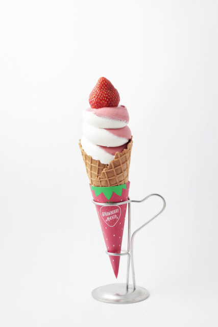 さっぱりしたストロベリーソフトと、ミルク感たっぷりのミルクソフトの、両方味わえるミックスソフトに大粒いちごを丸ごと1粒乗せちゃいました!