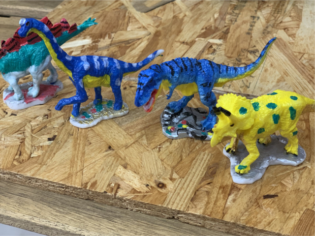 ティラノサウルス、トリケラトプスなど⼈気の恐竜たちの、まだ着色されていない“ホワイトフィギュア”を選びます。それに水性アクリル絵の具と筆を使って、自分だけのダイナソーワールドをつくるワークショップです。オリジナル恐竜をデザインしちゃおう!