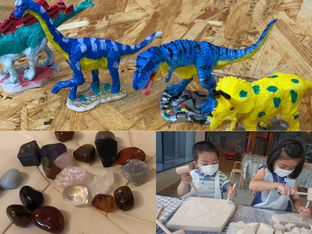 本物の化石発掘体験や、宝探し感覚で楽しめる鉱石発掘体験、子どもの想像力を養うペイント・ザ・ダイナソーなど、子どもたちの創作意欲を膨らませ、楽しみながら学べるワークショップが用意されています。
