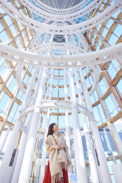 タワーの内部から上を見ると、鉄柱とリングからなる白い骨組みが複雑な模様を描き、独特な構造がよくわかります。フレームには鳥取県日南町産の杉材がふんだんに使われ、周囲は全面ガラス張り。陽光が差し込む空間で建築美に見惚れた後は、エレベーターに乗って最上階にある展望室に向かいましょう。