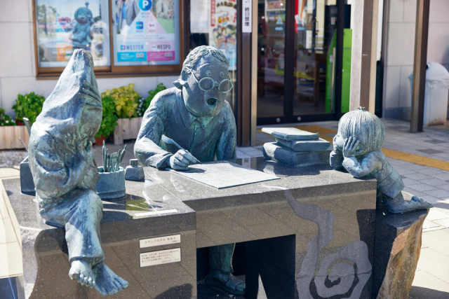 JR境港駅前には、「水木しげる先生執筆中」というブロンズ像もあります。作者の水木しげる氏が机に向かって漫画を描いている様子を、頬杖をついて眺める鬼太郎と、目玉おやじやねずみ男が見守っているシーンに、思わずにっこり笑みがこぼれます。