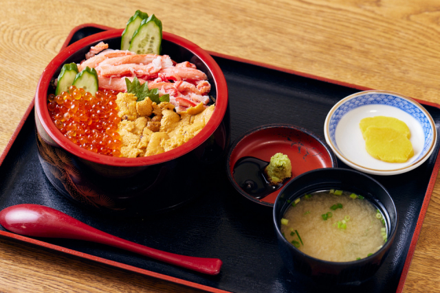 海鮮丼のなかでもとくにおすすめなのは、カニ・ウニ・イクラが乗った味覚丼です。酢飯の上には、境港特産の紅ズワイガニがたっぷり!紅ズワイガニは9〜6月まで長期間にわたって水揚げされますが、とくに冬場は海水の気温が下がることで鮮度が保たれ、甘みや風味が増すのだそう。東北や北陸などから厳選して仕入れたウニとイクラも一緒に、贅沢な味わいを楽しんでくださいね。
