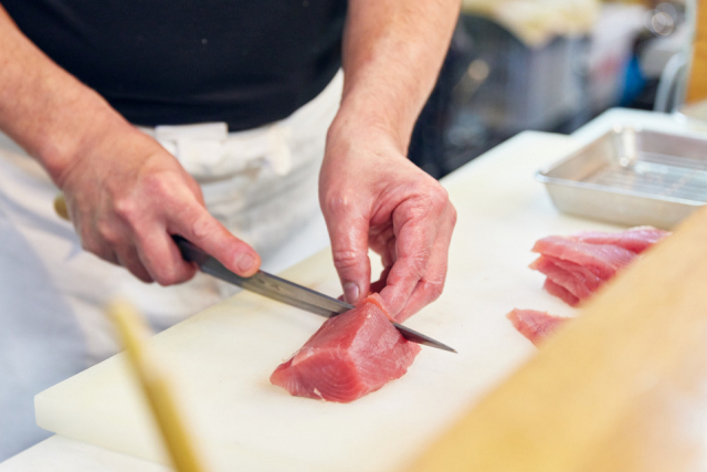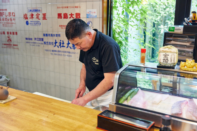 「旬の漁師料理 和泉」は、境港から毎朝仕入れる魚介を使った海鮮料理が味わえるお店です。板場に立つご主人は元漁師で、境港の魚を知り尽くすプロフェッショナル。カウンターのケースには、境港産を中心とする新鮮な魚介がずらりと並んでいます。