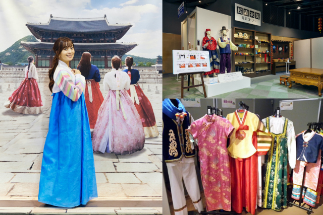 展示室のなかには、民族衣装試着コーナーがあります。韓国のチマチョゴリやロシアのサラファン、中国やモンゴルの民族衣装がたくさん揃い、靴や帽子などの小物もいっぱい。これらはすべて自由に試着することができ、それぞれの国をイメージしたフォトスポットの台に乗って記念撮影することもできます。試着も撮影も無料なので、色々試してみてくださいね。