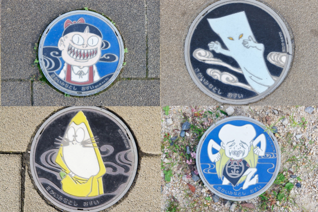 ふと足元を見ると、そこにも妖怪が…。車道には、一反もめんに乗った鬼太郎モチーフのマンホールが13カ所、歩道や沿道には下水道の蓋が7種類・74箇所にあります。ブロンズ像と合わせて、妖怪モチーフも探してみてくださいね。