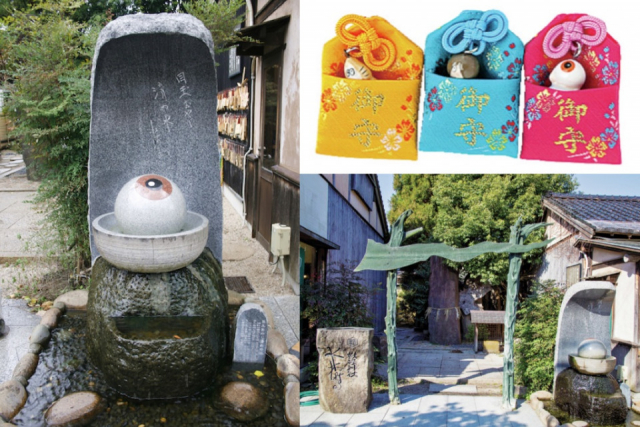 ©︎水木プロ (左)目玉おやじが浮かぶ手水舎(右上)ポケットお守り650円(右下)鳥居の横木は一反もめんがモチーフ