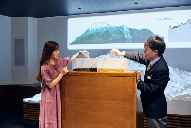 工場見学ではまず、どのようにして天然水が育まれるかを紹介。工場周辺の山々をかたどった大きなジオラマに、プロジェクションマッピングが投影され、わかりやすく学ぶことができます。