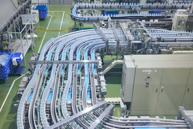 続いては製造ラインへ。こちらの工場では、2ℓのペットボトルを1分間に最大365本も製造しています。ペットボトルの容器製造から、天然水のボトリング、容器の包装まで、各工程をじっくりと見学しましょう。