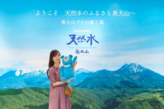 工場のエントランスには、奥大山の風景が写し出されたパネルが設置されています。工場限定のキャラクター「ミズクマ」のぬいぐるみと一緒に、ぜひ記念撮影をしてくださいね。