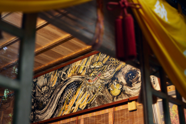拝殿の中には、日野町出身の濱田珠鳳氏が描いた「龍神之図」が飾られています。こちらは「指画」とよばれる中国の伝統技法によって、筆を一切使わず、指や爪などで描かれた貴重な作品。「福が訪れるように」との願いが込められているので、ぜひご覧ください。