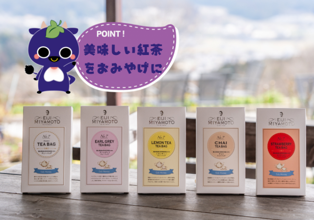 「アーリーモーニング」の紅茶は、おみやげとしても人気を集めています。定番のアールグレイをはじめ、岡山県産のイチゴをブレンドしたストロベリーティーや、数種類のスパイスをブレンドしたチャイなどもあるので、ご自宅でのティータイムにもぜひ!