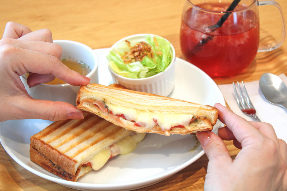 ランチタイムの人気メニューといえば、外はカリッと香ばしく焼き上げ、中には具がたっぷり入ったホットサンド。マルゲリータ・ハニーマスタードチキン・チーズハンバーグの定番3種に加えて、期間限定の特別メニューも登場します。