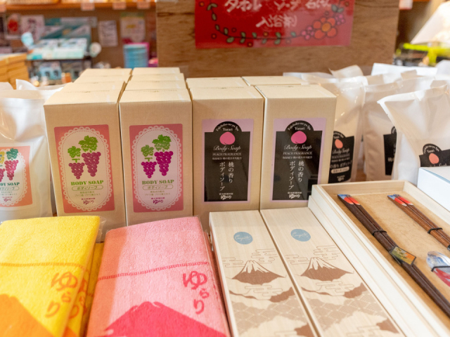 食事を楽しんだ後は、売店へ。山梨県の名産をはじめ、「富士眺望の湯ゆらり」のオリジナルグッズも揃っていました。