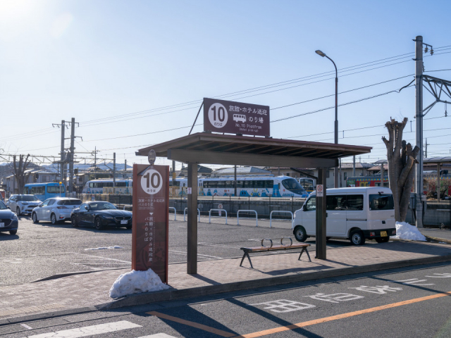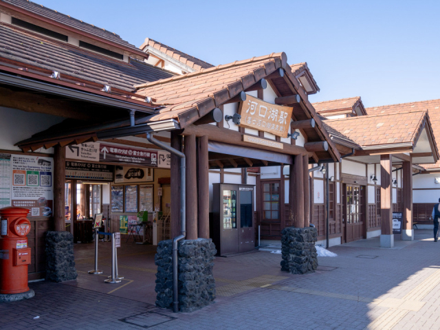 電車、または長距離バスから路線バスを乗り継いで富士急行線の「河口湖駅」に到着したら、送迎バス乗り場に向かいます。すでに富士山がドーン!と見え、温泉での景色にも期待が高まります…!